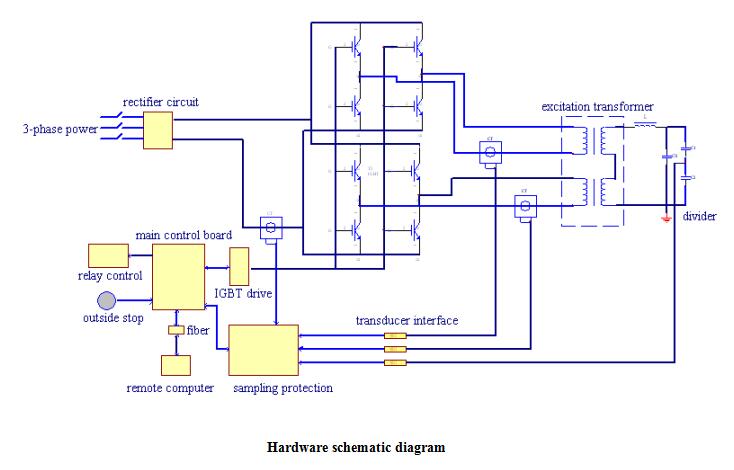The variable frequency power source adopts ARM and FPGA digital signal processor with high-speed, receiving order from remote computer, which realizes high-level control of the whole test procedure. FPGA digital signal processor with high-speed real-time calculates and changes output waveform, real-time test high voltage value and main circuit parameters of converter power, and return test parameters, operating status to upper machine, real-time sample protecting signals, fast close power output and its waveform generator.